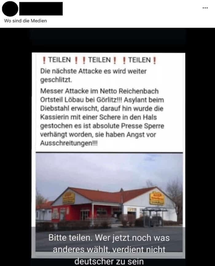 Dieser Artikel stammt von CORRECTIV.Faktencheck / Zur Quelle wechseln „Wo sind die Medien“, fragt ein Nutzer auf Facebook und teilt ein Foto von einer Netto-Filiale mit einer angeblichen Meldung darüber. „Die nächste Attacke, es wird weiter geschlitzt“, heißt es dort. Ein „Asylant“ habe im Netto Reichenbach, Ortsteil Löbau, bei Görlitz…