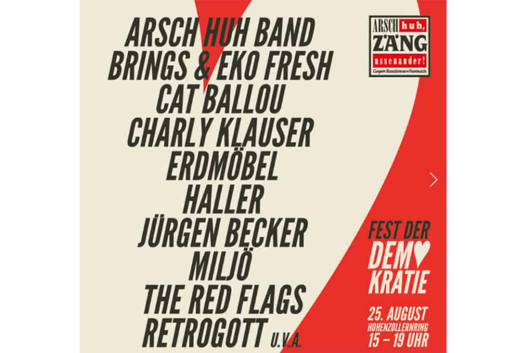 Report-K Der Screenshot zeigt die Ankündigung zum “Fest der Demokratie” von “Arsch huh”. | Screenshot von der Website von “Arsch huh” Köln | Die Musikerinitiative „Arsch huh“ veranstaltet mit vielen anderen Mitwirkenden am 25. August 2024 auf dem Kölner Hohenzollernring ein „Fest der Demokratie“. Mit dabei ist nicht nur die…