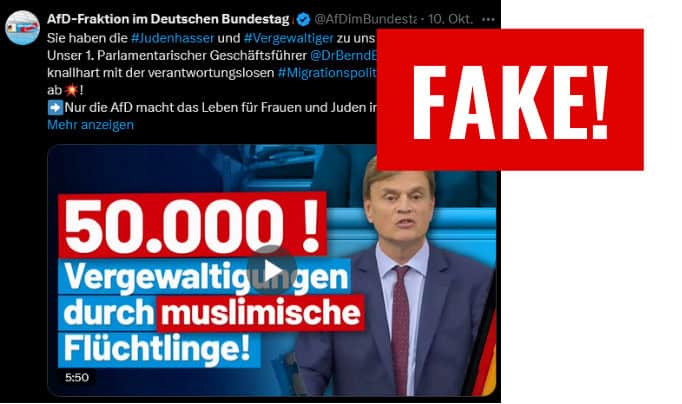 Besonders zynisch wird es allerdings, als der AfDler über sexuellen Missbrauch redet. Dabei prangerte er nicht an, dass in Deutschland jede Woche im Schnitt drei Frauen von ihrem Partner oder Ex-Partner ermordet werden. Er kritisierte auch nicht die unzureichenden Mordmerkmale, die verhindern, dass Femizide in Deutschland konsequent als Morde verfolgt werden können. Denn es geht Baumann ja nicht um den Schutz von Frauen, es geht um Hass. Deswegen erfand er einfach mal eine Zahl: 50.000 Vergewaltigungen durch muslimische Flüchtlinge sollen es gewesen sein. Auch auf Twitter verbreitete die AfD-Fraktion diese Zahl, ohne jegliche Quelle.