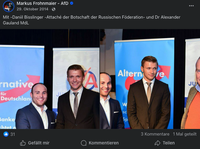 Frohnmaier sorgt seit Jahren für Schlagzeilen: Lange galt er als Russland-Freund. So organisierte er schon 2014 – ein halbes Jahr nach der Krim-Annexion – als damaliger Landesvorsitzender der Jungen Alternative (JA) ein Treffen mit dem russischen Botschafts-Attaché Daniil Bisslinger unter dem Motto „Russland: Dialog statt Konfrontation!“.
