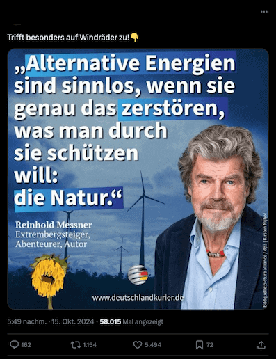 Auf X gefällt mehr als 5.000 Nutzerinnen und Nutzern ein angebliches Zitat des Bergsteigers und Autors Reinhold Messner. Er soll gesagt haben: „Alternative Energien sind sinnlos, wenn sie genau das zerstören, was man durch sie schützen will: die Natur.“ Die Äußerung kursiert auch auf Linkedin und Facebook, teilweise mit Verweis auf und mit dem Zeichen der Anti-Grünen-Kampagne „Grüner Mist“.