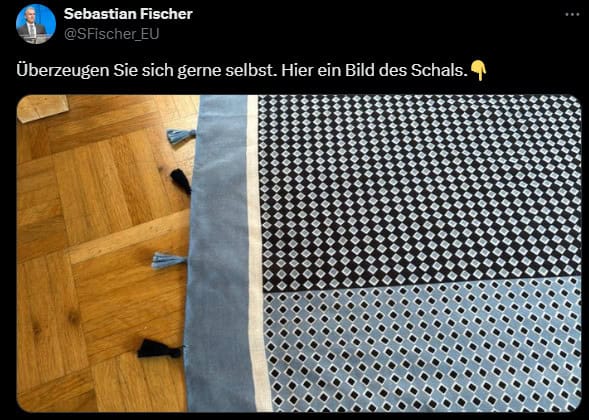 Der Sprecher des Auswärtigen Amts postete auch ein Bild des ganz gewöhnlichen Schals, der wirklich nicht wie ein Pali-Tuch aussieht, wenn man nicht unbedingt etwas sehen will, was man aus ideologischen Gründen sehen muss.