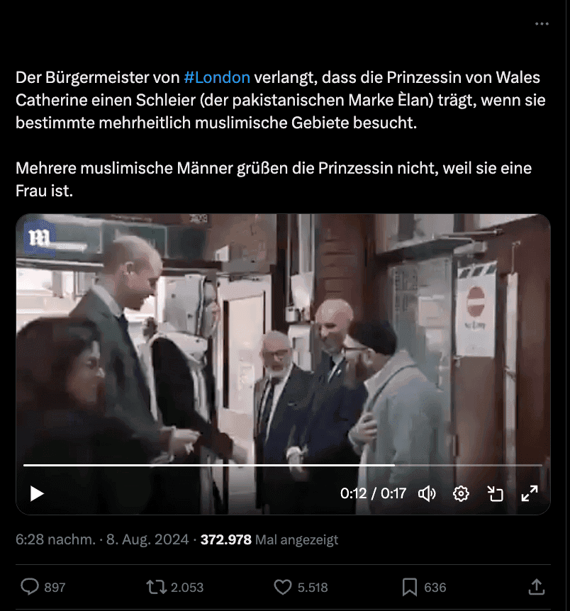 Behauptet wird in dem Zusammenhang, die „muslimischen Männer” hätten Middleton nicht gegrüßt oder ihr den Handschlag verweigert. Englischsprachige X-Beiträge mit der Behauptung erreichten teils Millionen Aufrufe. Einige deutsche Beiträge behaupten dazu, der Bürgermeister von London verlange von der Prinzessin von Wales, sich zu verschleiern, wenn sie „bestimmte mehrheitlich muslimische Gebiete“ besuche.