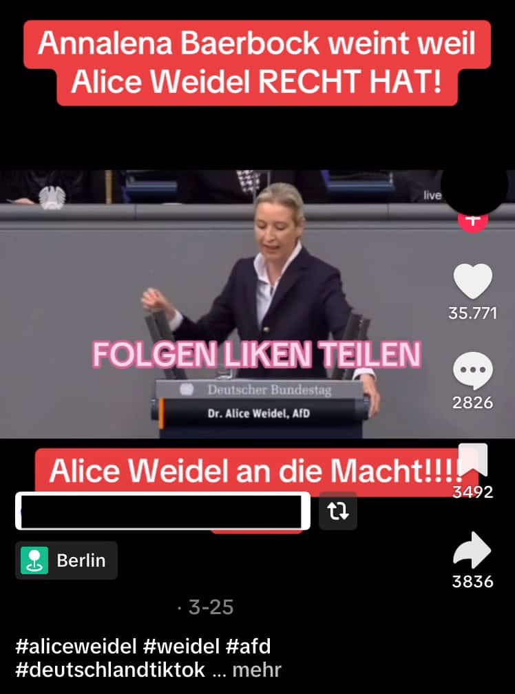 Mehr als 35.000 Tiktok-Profilen gefällt, dass Annalena Baerbock, die bald aus dem Amt scheidende Außenministerin, bei einer Rede der AfD-Vorsitzenden Alice Weidel im Bundestag, geweint haben soll. Diesen Eindruck erweckt ein 20-sekündiges virales Tiktok-Video Ende März 2025. Andere Profile kopierten das Video und verbreiten es noch immer weiter.