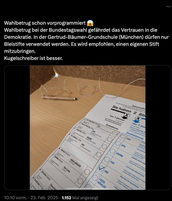 2017, 2021 und auch 2025: Bei allen drei Bundestagswahlen warnen Nutzerinnen und Nutzer in Sozialen Netzwerken davor, den Stimmzettel nicht mit einem Bleistift auszufüllen (hier, hier und hier). So schreibt eine Nutzerin aktuell, in der Gertrud-Bäumer-Grundschule in München dürften nur Bleistifte verwendet werden, der Wahlbetrug sei „schon vorprogrammiert“. Im geteilten Bild ist ein Stimmzettel aus dem Wahlkreis 219 in München zu sehen. Ein Stift liegt an einem Seil angebunden auf einem Tisch.