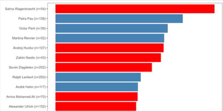 Neben Wagner kommt vor allem der Politikwissenschaftler Dr. Jan Philipp Thomeczek zu diesem Schluss. Er analysierte in einer Studie (noch vor der Abspaltung von Wagenknecht & Co.) die Sprache von Politiker:innen der Linkspartei auf die Verwendung von Populismus. Das Ergebnis: Sahra Wagenknecht verwendete mit Abstand die meiste populistische Rhetorik. Übrigens: Auch die meisten anderen Linke-Politiker, die mittlerweile zum BSW gewechselt sind (rot markiert), finden sich in der Populismus-Top-10.