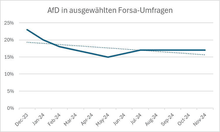 Schaut man sich zum Beispiel die Entwicklung der AfD in den Umfragen der Forsa an, sieht man den Abwärtstrend deutlich. Ende letzten Jahres lag die AfD bei 22 %, sogar 23 %. Heute sind es 17 %.