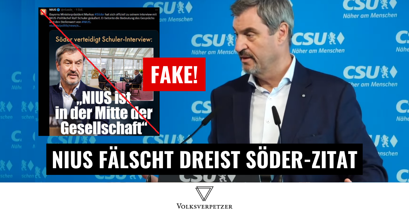 Beim Legitimieren rechtsradikaler Narrative hat Bayerns Ministerpräsident eine weitere Grenze überschritten: Er hat dem Fake-News-Medium „NIUS“ ein Interview gegeben. NIUS wird vorgeworfen, inzwischen als eines der inoffiziellen Vorfeld-Medien der rechtsextremen AfD zu fungieren. Wie um zu beweisen, wie dreist das Medium täuscht, hat es in diesem Kontext prompt dem CSU-Chef falsche Worte in den Mund gelegt. Genau deshalb spricht man mit einem als Journalismus getarntem Propaganda-Medium nicht! Der Faktencheck: