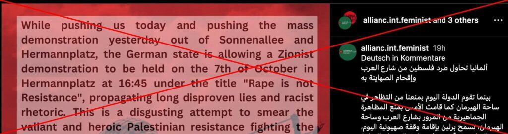Die Organisatoren des Protestes, unter anderem „Palestine Speaks“, leugnen diesen Fakt. In Instagram Posts werden die Mörder und Vergewaltiger vom 7. Oktober als „Valiant Heroic Resistance“ bezeichnet, also mutige, heldenhafte Widerstandskämpfer.