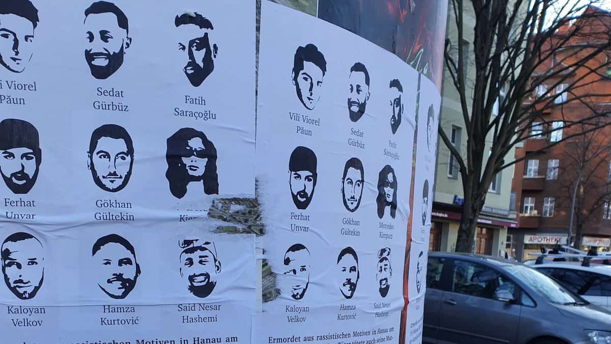 Plakate im Andenken an die Opfer des rechtsterroristischen Attentats von Hanau im öffentlichen Raum in Berlin, März 2020.