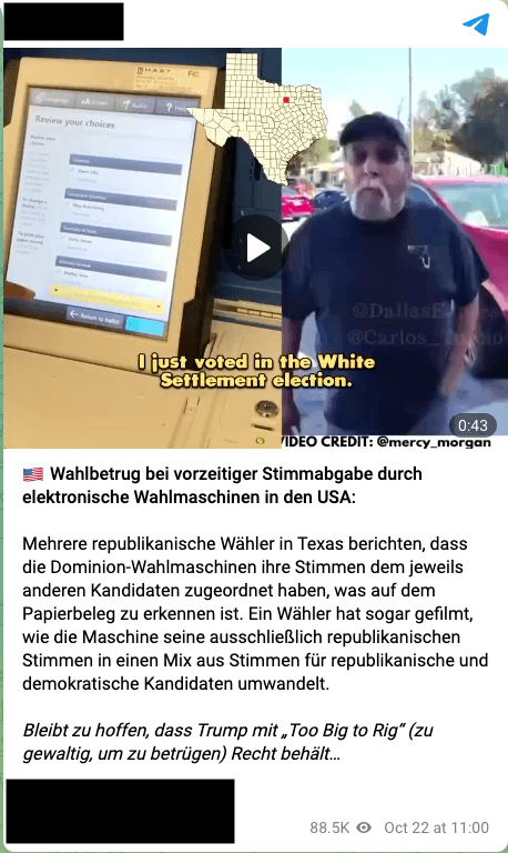 Gleich zu Beginn der Wahl verbreitete sich online ein Videozusammenschnitt, der angeblich Wahlbetrug belegen soll. Das Video auf der rechten Bildschirmhälfte zeigt Interviews mit zwei Männern. Sie sagen, in White Settlement, einer Stadt im US-Bundesstaat Texas, seien Stimmen durch den Wahlautomaten falsch zugeordnet worden. Der erste Mann sagt, er habe es selbst erlebt; der andere gibt an, es von zwei anderen Personen gehört zu haben. Das Video auf der linken Bildschirmhälfte zeigt parallel zu den Interviews einen Wahlautomaten, auf dem eine Person abstimmt und anschließend den gedruckten Stimmzettel in die Kamera hält.