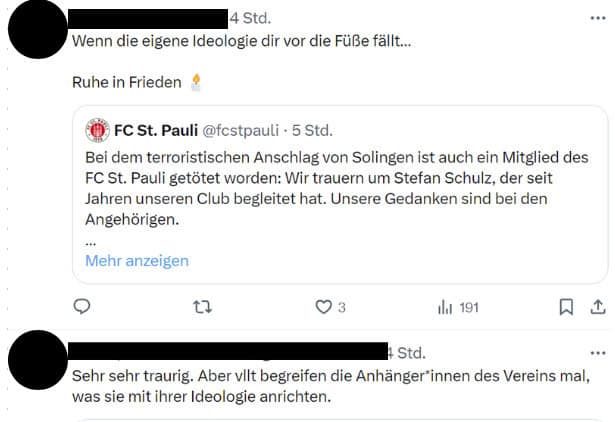 Während sich Politiker:innen nach dem abscheulichen Solingen-Attentat, das mutmaßlich aus islamistischer Gesinnung geschah, mit populistischen Forderungen überbieten, treiben Rechte die gesellschaftliche Spaltung weiter voran. Exemplarisch ist dies am Beispiel der Hasswelle zu erkennen, die nun den Hamburger Traditionsfußballverein St. Pauli trifft. Ein Opfer von Solingen war St. Pauli-Mitglied.