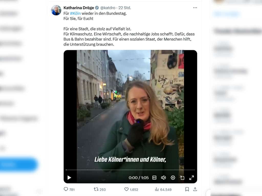 Köln | Die grüne Fraktionsvorsitzende und Kölner Direktkandidatin für den Deutschen Bundestag Katharina Dröge hat vor 22 Stunden ein Video auf ihren Kanal bei „X“ hochgeladen. Sie will von den Kölner:innen in ihrem Wahlkreis Köln III eingeladen werden. Na dann.