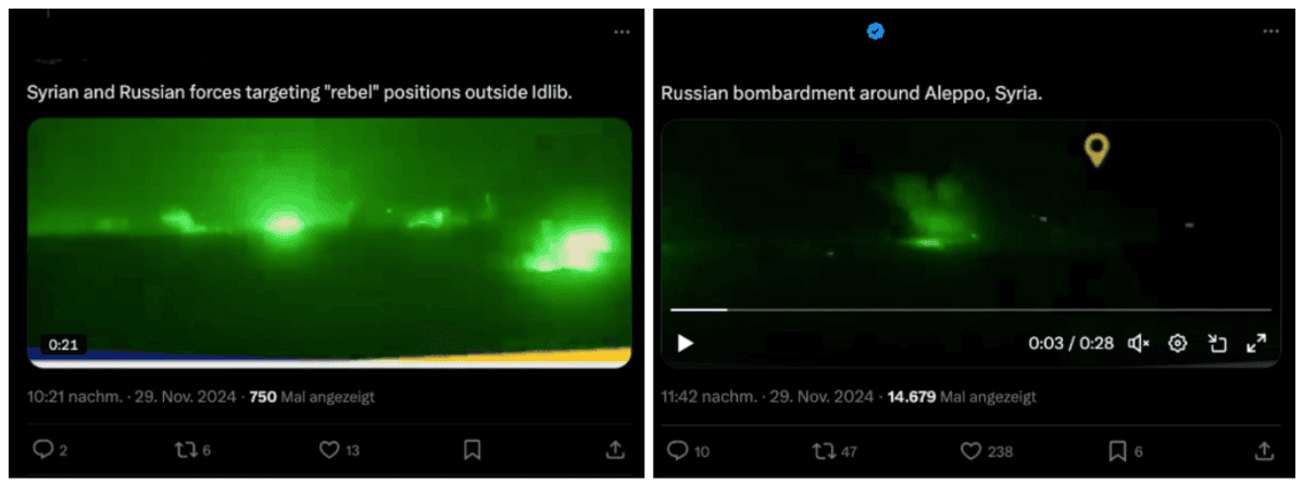 Ein Video, das sich seit dem 29. November international in Sozialen Netzwerken verbreitet, etwa auf X und Facebook, soll einen Angriff auf Standorte der Rebellen im Norden Syriens durch syrische und russische Kräfte zeigen. Mal ist von Idlib, mal von Aleppo die Rede. Beides sind die Namen von Städten wie auch größeren Regionen im Nordosten Syriens. In einem deutschen Telegram-Beitrag wird das Video mit Aufnahmen geteilt, die ebenfalls aktuelle Luftschläge in Syrien zeigen sollen.