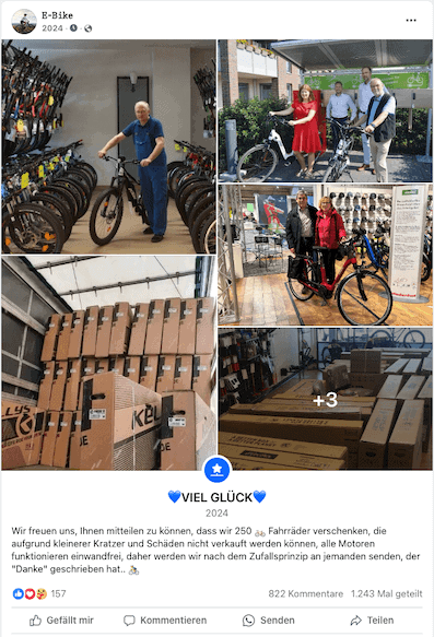 Tausende Nutzerinnen und Nutzer haben im Oktober angebliche Gewinnspiele auf Facebook geteilt und kommentiert. Die Seiten dahinter heißen immer „E-Bike“ – mal mit Punkt am Ende, mal ohne. Auch das Versprechen ist identisch: Wegen kleinerer Kratzer, würden 250 Fahrräder per Zufallsprinzip verlost. Dafür müsse man die Beiträge nur mit „Danke“ kommentieren.