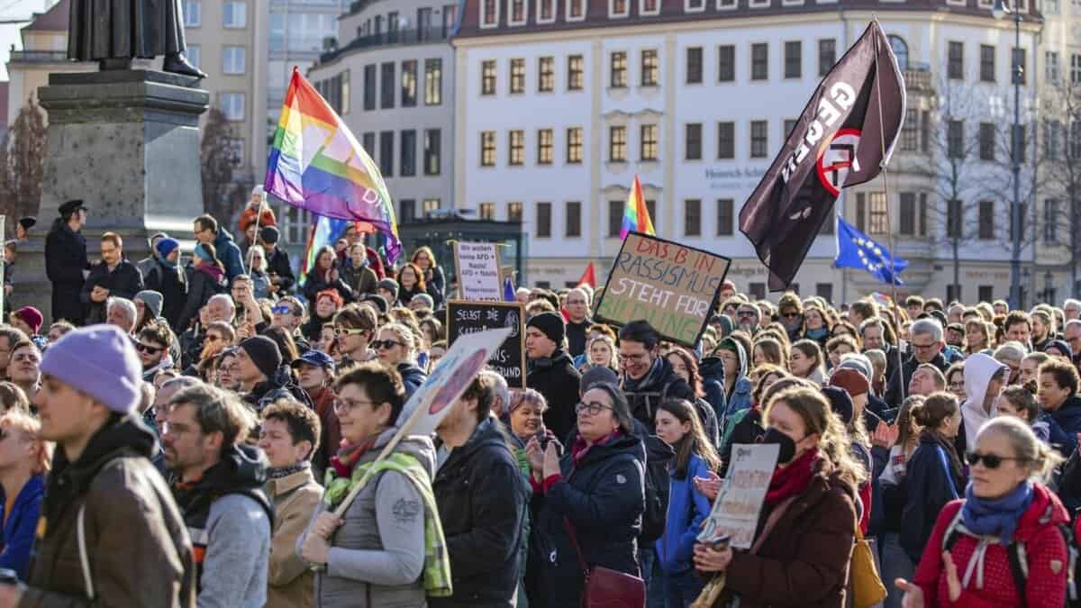 In Dresden demonstrierten im Februar tausende Menschen unter dem Motto ‘Wir sind die Brandmauer’ gegen die AfD und den Rechtsruck.