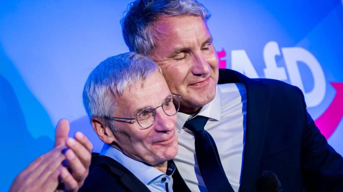 Ziemlich gute Freunde: Christoph Berndt und Björn Höcke, die AfD-Landeschefs von Brandenburg und Thüringen feiern die Ergebnisse der rechtsextremen Partei in Brandenburg.