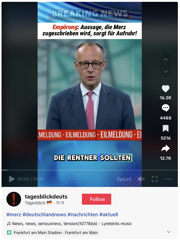 „Ja, er hat es gesagt!“ wird in einem Video mit mehr als 16.000 Likes behauptet. Er: Bundeskanzler Friedrich Merz. Es: den Satz „Die Rentner sollten aus diesem Land verschwinden!“ Die Tiktok-Videos mit dem angeblichen Zitat von Merz wurden auch in anderen Sozialen Netzwerken weiterverbreitet, insbesondere auf Facebook. Die Beiträge enthalten Kommentare wie: „Am liebsten würde er euch töten lassen“ oder „Das hat Friedrich Merz wortwörtlich gesagt […]. Hier ist es live, die Rentner sollen verschwinden, am besten gleich in den Sarg“.
