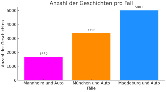 „Auf Newswhip werden uns mit den gleichen Suchkriterien 4.312 deutsche Onlineartikel nach dem Anschlag auf den Magdeburger Weihnachtsmarkt angezeigt. Zum Anschlag in München 4.349 und zur Tat in Mannheim 2.479. Nur am Tag der Tat wurde über Mannheim mehr berichtet als über Magdeburg. Dies könnte mit dem Zeitpunkt der Taten zu tun haben. Während die Angriffe in Mannheim und München gegen 12:15 Uhr und 10:30 Uhr begangen wurden, war es in Magdeburg bereits Abend (19:04 Uhr).“