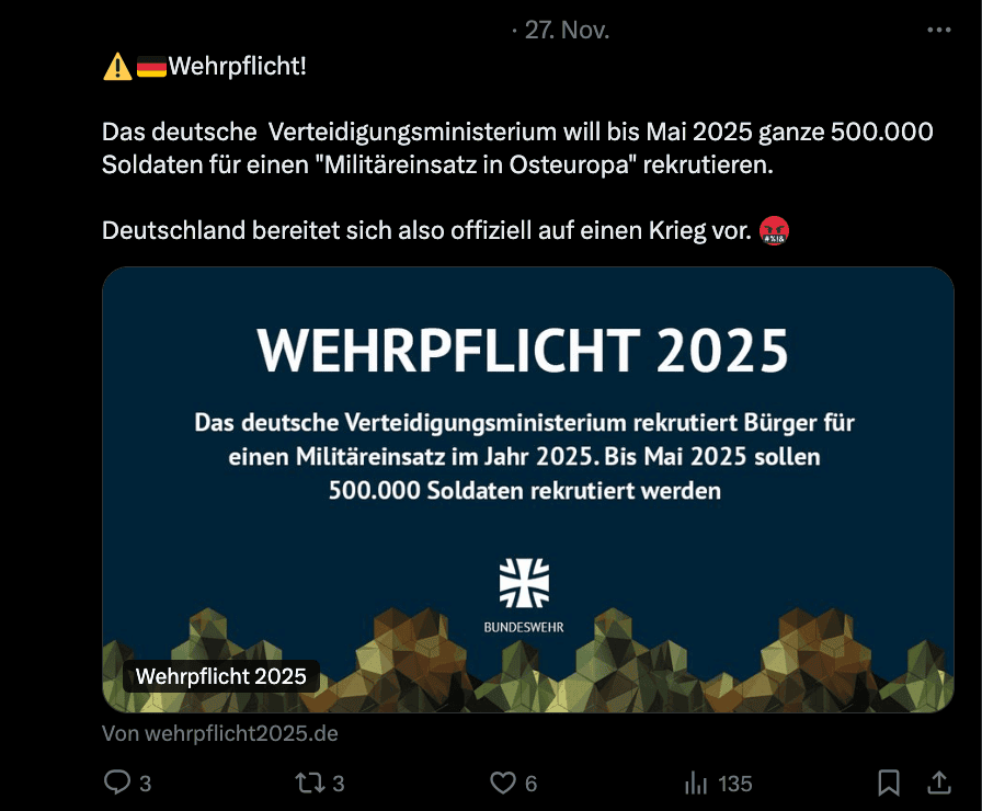 Dieser Artikel stammt von CORRECTIV.Faktencheck / Zur Quelle wechseln „Wehrpflicht!“ oder „Wehrpflicht reloaded“, heißt es Ende November in Beiträgen auf X, Telegram und Tiktok zu einer angeblichen Webseite der Bundeswehr. Dazu schreiben Nutzerinnen und Nutzer, dass das deutsche Verteidigungsministerium bis Mai 2025 eine halbe Million Soldaten für einen Militäreinsatz in…