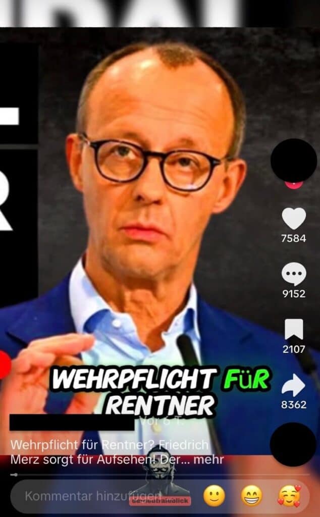 Dieser Artikel stammt von CORRECTIV.Faktencheck / Zur Quelle wechseln Sollte Friedrich Merz (CDU) Kanzler werden, sei seine erste Amtshandlung, die Wehrpflicht für Rentner zu diskutieren. Das habe Merz bereits angekündigt. So lautet zumindest die Behauptung eines Tiktok-Videos, das über 400.000 Mal aufgerufen wurde. Demnach wolle Merz auch, dass Rentner während…