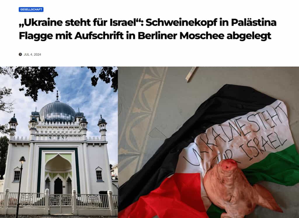 Dieser Artikel stammt von CORRECTIV.Faktencheck / Zur Quelle wechseln In einem Beitrag einer dubiosen Publikation namens „Berliner Wochenzeitung“ wird behauptet, in der Berliner Moschee im Stadtteil Wilmersdorf sei in der Nacht zum 4. Juli 2024 ein Fenster eingeschlagen und ein in eine Palästina-Flagge gewickelter Schweinekopf hineingeworfen worden. „Ukraine steht für…