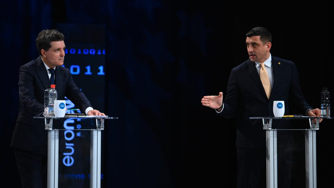 Die Kandidaten der Stichwahl zur Präsidentschaftswahl in der Debatte. George Simion, Vorsitzender der rechtsnationalen Partei AUR (rechts), und Nicușor Dan, parteiloser Bürgermeister von Bukarest (links).