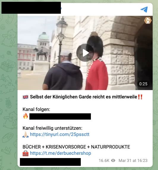 „Selbst der Königlichen Garde reicht es mittlerweile“, heißt es zu einem kurzen Video auf X, Telegram und Facebook. Zu sehen ist, wie ein angebliches Mitglied der britischen königlichen Garde in London einen tanzenden Passanten zu Boden schlägt. Unter den Beiträgen mit teils mehr als 400.000 Ansichten sammelt sich rassistische Hetze in den Kommentaren, weil die angegriffene Person schwarz ist.