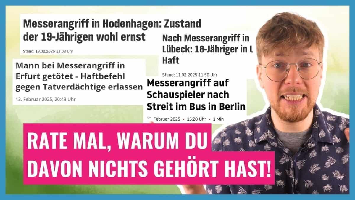 In Hodenhagen stach am 17. Februar ein 43.Jahre alter Deutscher auf eine zufällige Passantin ein. Am 12. Tötete ein Deutscher eine Französin mit dem Messer in Offenburg. In Ratingen hat die polizei am 13. Schüsse auf einen Deutschen messerangreifer abgegeben. Am 11. Hat ein Mann in Lübeck einen anderen niedergestochen. Am 13. Wurde ein Mann in Erfurt durch einen Messerstich getötet. Rate Mal, warum du von diesen Vorfällen nichts gehört hast und warum diese Messerangriffe nicht getrendet sind. Das ist der Begleitartikel zu unserm neuen Video und ein Update und Korrektur zu diesem Artikel.