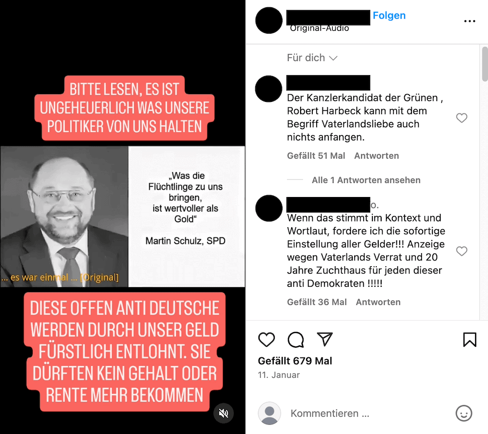 „Bitte lesen, es ist ungeheuerlich, was unsere Politiker von uns halten“, heißt es auf Instagram zu den Zitaten. Doch in mehreren Fällen sind die angeblichen Äußerungen nie gefallen. Auf eine Anfrage von uns antwortete der Profilinhaber nicht.