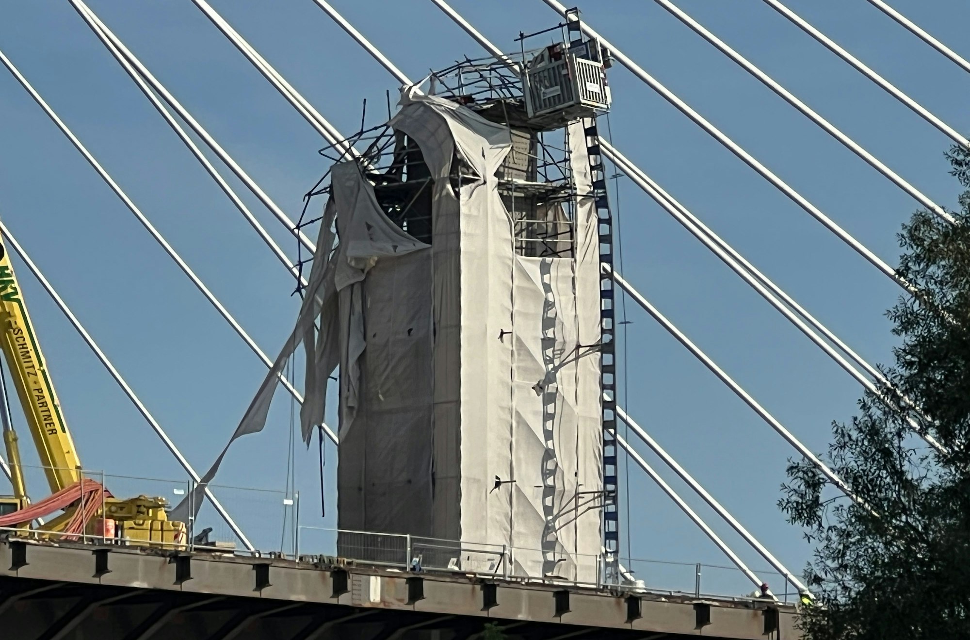Ein Tag vor dem tödlichen Unglück: Der Kran hilft bei den Abrissarbeiten des alten Pylons. Über dem Pfeiler sind noch die roten Tragseile der alten Brücke gespannt.