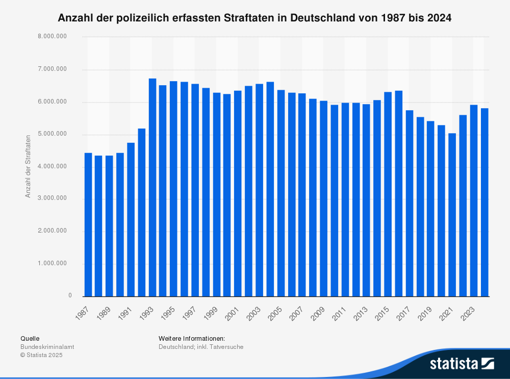 Schaut man in der Polizeilichen Kriminalstatistik des Bundeskriminalamts, wie sich die Kriminalität in Deutschland seit den Fluchtbewegungen 2015, auf die Trump wohl anspielt, entwickelt hat, zeigt sich: 2021 lag die Zahl der polizeilich erfassten Straftaten in Deutschland so niedrig wie seit 1991 nicht mehr. Seit Mitte der 90er- Jahre liegt diese Zahl zudem konstant zwischen 5 und 6,7 Millionen pro Jahr. „Kriminalitätsfrei“ war Deutschland also nie, daran haben auch die Amtszeiten von Merkel oder ihre Flüchtlingspolitik nichts geändert.