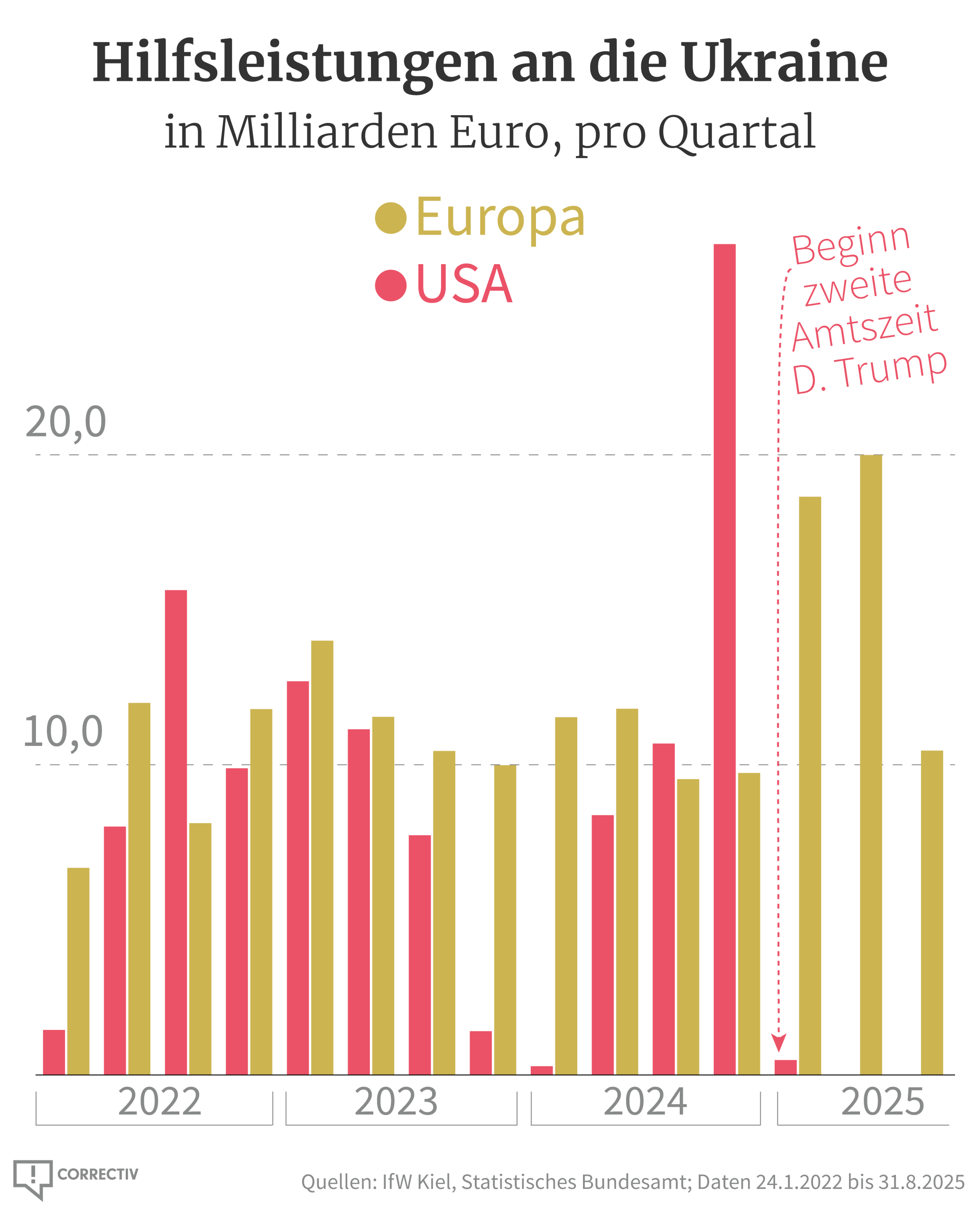 Daten des IfW zeigen auch, dass die Unterstützung durch die USA nach Trumps Antritt seiner zweiten Amtszeit 2025 komplett eingebrochen ist. Damit, dass die USA kein Geld mehr senden, hat Trump also vorerst größtenteils recht, allerdings könnte sich die Situation schon bald ändern.