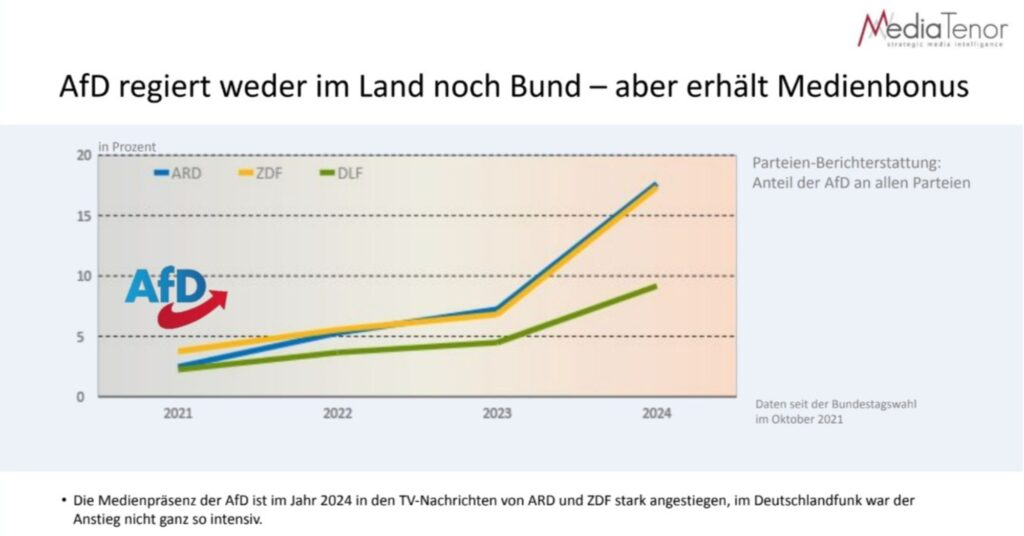 Die AfD wird insbesondere auch von ARD, ZDF und DLF mit großer Aufmerksamkeit belohnt. Gerade im Wahljahr 2024 bekam die rechtsextreme Partei extrem viel Reichweite geschenkt – mehr sogar als die Grünen oder Linken, die immerhin im Bund respektive in den Bundesländern Thüringen und Sachsen, in denen gewählt wurde, an den jeweiligen Regierungen beteiligt waren.