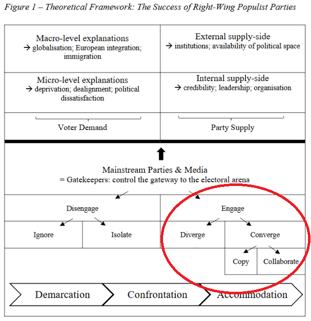 Sie argumentiert aber, dass das nicht der einzige Grund sein kann, weil er den Erfolg in manchen Ländern nicht erklärt, während Rechtspopulisten in anderen Regionen, wo sie demnach Erfolg haben müssten, keine Wahlerfolge verzeichnen. Im (armen) belgischen Wallonien ist die extreme Rechte sogar quasi nicht existent. Im reichen Flandern aber sehr stark. De Jonge erklärt, warum: Einmal liegt es an den Mainstream-Parteien, die bewusst und unbewusst die Räume dafür schaffen. Sie machen das, indem sie die politischen Ränder unbesetzt lassen oder sich vom klassischen Wählerklientel entfernen (wie Sozialdemokraten von Arbeitenden und Gewerkschaften). Wie das genauer funktioniert, darauf kann ich in einem späteren Artikel eingehen. Ich beabsichtige, mich hier auf die Rolle der Medien zu fokussieren.