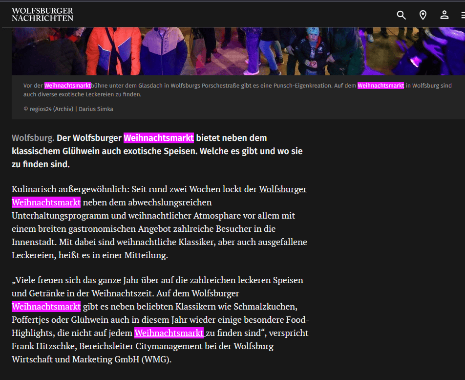 Um es kurz zu machen: Der Wolfsburger Weihnachtsmarkt heißt Weihnachtsmarkt. Diese Selbstverständlichkeit muss ich aussprechen, weil man dich darüber belügen will. Ja, auch im Jahr 2024 versuchen Rechte dich immer noch plump für dumm zu verkaufen. Wenn man einfach nur „Weihnachtsmarkt Wolfsburg“ googelt, ist alles voll mit Erwähnungen vom „Wolfsburger Weihnachtsmarkt“. Ein Artikel der Wolfsburger Nachrichten über „Food-Highlights“ auf dem Wolfsburger WEIHNACHTSMARKT ist voll mit dem Begriff WEIHNACHTSMARKT. Und wir auch so offiziell von einem Vertreter der Stadt bezeichnet. Ich habe das Wort „Weihnachtsmarkt“ für etwa der Recherche unfähigen „Journalisten“ markiert: