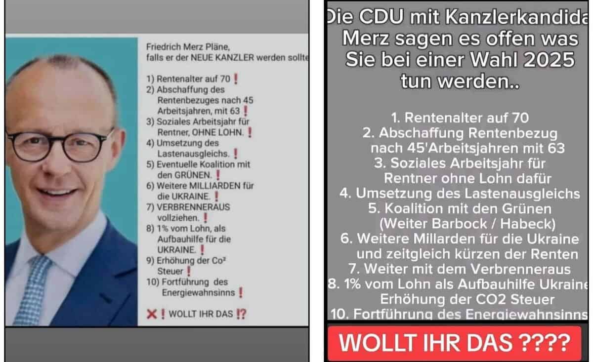 Dort verbreiten sich Sharepics mit zehn vermeintlichen Forderungen von Friedrich Merz, die er als Kanzler umsetzen würde: Von der Erhöhung des Rentenalters bis zum Verbrenner-Aus.