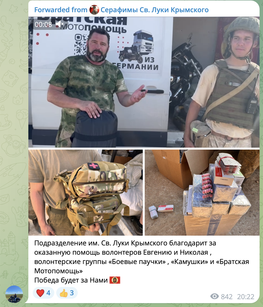 Es ist die Umgebung, die ihn kurz nach dem russischen Überfall auf die Ukraine möglicherweise dazu gebracht hat, die „Bruderschaft Motohelfer“ ins Leben zu rufen. Anfangs ging es darum, in den Wirren der ersten Kriegstage in Deutschland gestrandete russische LKW-Fahrer zu unterstützen. In frühen Gruppenbeiträgen lässt sich nachlesen, wie Gruppenmitglieder Hilfsaktionen koordinierten. Zu sehen sind Fotos von Autos, vollgepackt mit Wasserflaschen und Essen und dankbare Fahrer.